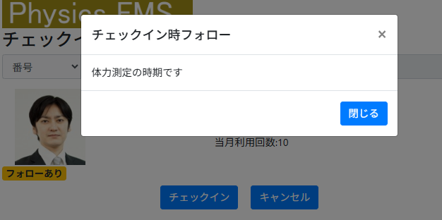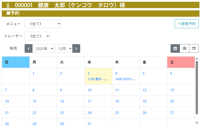 予約管理機能で、パーソナルトレーニングや体力測定などの予約が可能です。スタッフ指定の予約にも対応しています。