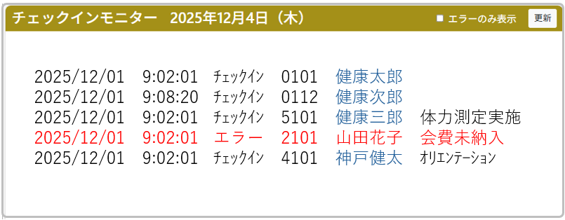 チェックインは、QRコードやスマートフォンでチェックインできるセルフチェックイン機能があります。利用料未納入などのエラーはチェックインモニターでスタッフにお知らせされます。