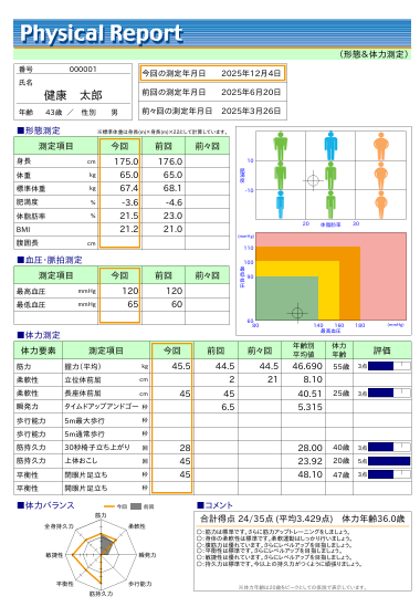 効果的にトレーニングをしていただくため、また、トレーニングの効果を実感いただくために定期的に体力測定を行うのが効果的です。体力測定の種目は、ご希望の種目を設定いたします。筋力マシンでの10RMなどの記録も可能です。