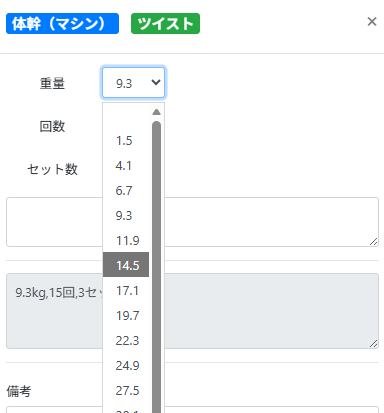 負荷などのパラメーターは選択式でタブレットでも簡単に入力できるので、パーソナルトレーニングで指導しながらの記録が可能です。